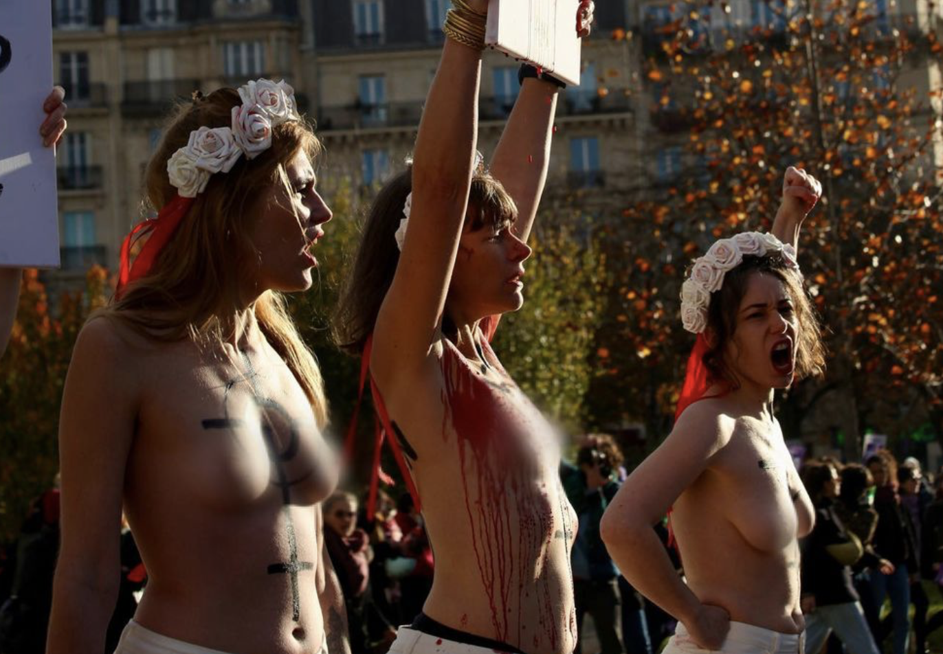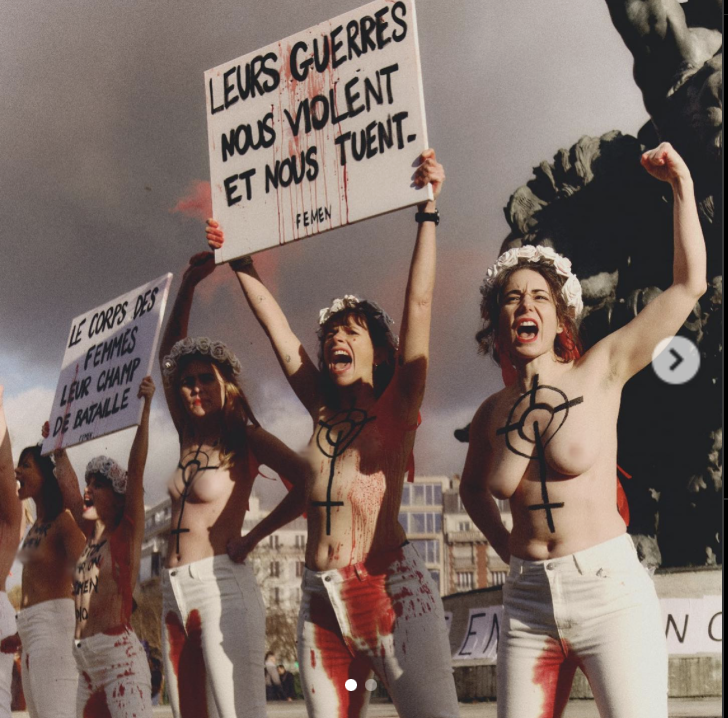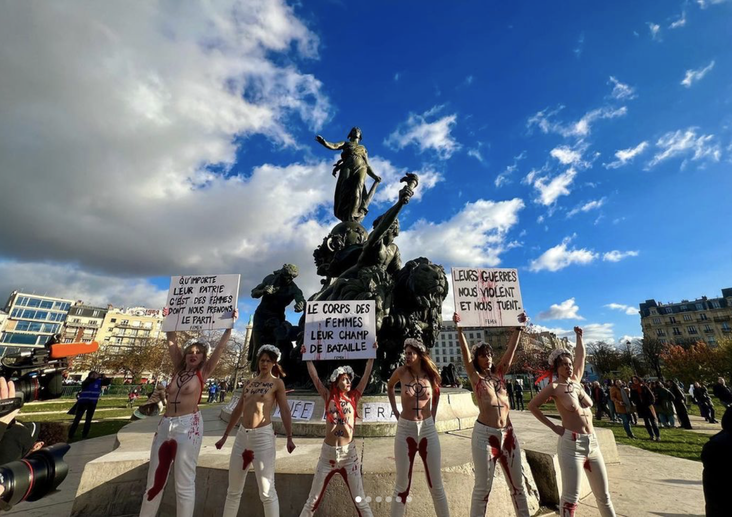 La manifestation a également été marquée par une action des Femen visant à dénoncer les crimes de guerre à l’encontre des femmes dans les conflits actuels. Des slogans comme « leurs guerres nous violent et nous tuent » ou encore « le corps des femmes, leur champ de bataille ». Connues pour la provocation de leurs actions, les Femen étaient vêtues d’un pantalon blanc tâché de faux sang à l’entre-jambe, d’un dessin de cible sur le torse et de leurs habituels seins nus.